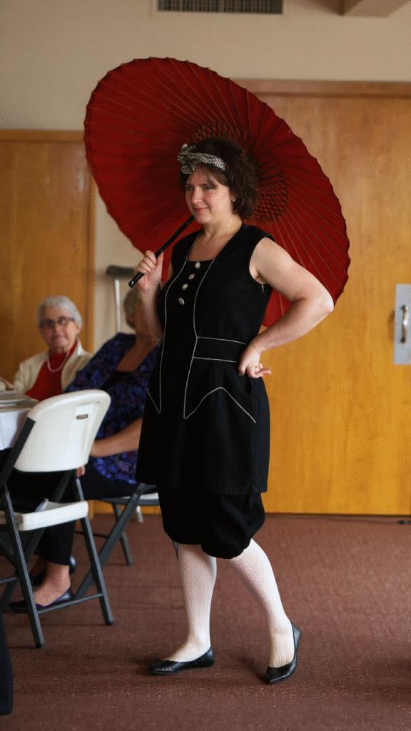 The exhibition also connects how fashion served as a symbol of identity, status, and political ideology. Figures such as the “Gibson Girl” characterized fashionable, independent, and athletic middle-class women. Women aspired to try new gender-defying activities, particularly sports like mountaineering and basketball. Suffragists of the time advocated not only for the right to vote but also for less restrictive and more practical clothing.